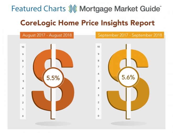 CoreLogic reports that home prices nationwide, including distressed sales, rose 5.6 percent year over year in September 2018 compared to September 2017. The 5.6 percent is down from June's 7.1 percent year over year increase as home price gains moderate to more historical levels. Month over month saw a 0.4 percent rise. From September 2018 to September 2019, CoreLogic forecasts a 4.7 percent gain ... still a great story with rates at historically low levels.