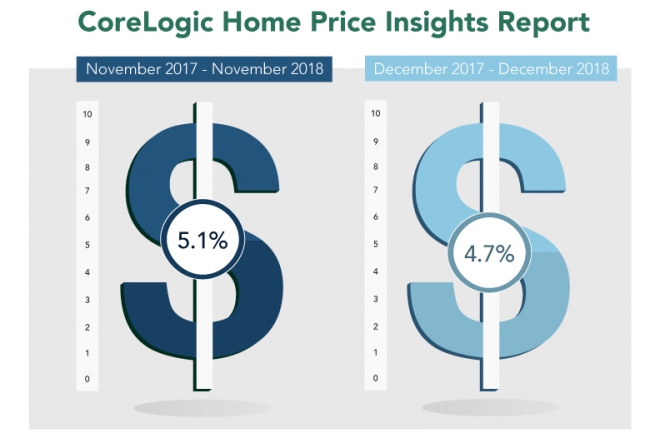 The pace of U.S. home price appreciation continued to slow in December, according to data from CoreLogic, with prices rising 4.7% compared with the year before and just 0.1% from November. Home price growth slackened significantly in the second half of 2018, slowing to an average of 5.2% for the last six months, down from 6.4% in the first six. CoreLogic predicts that home prices will see an annual increase of 3.4% in 2019.