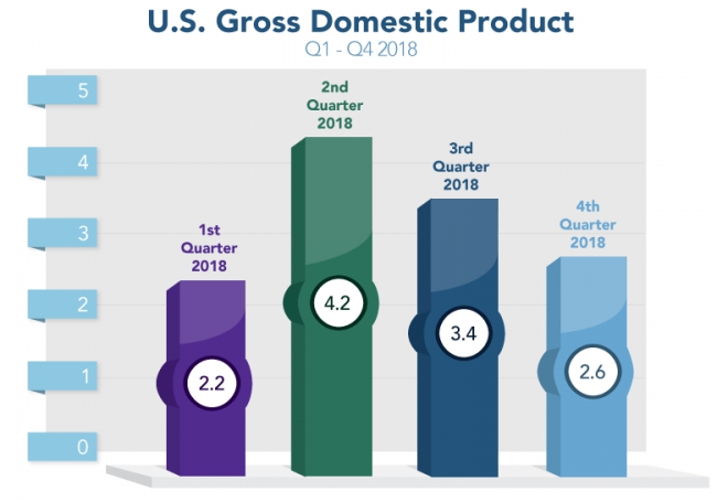 This past week, the Bureau of Economic Analysis (BEA) reported the U.S. economy, as defined by Gross Domestic Product (GDP), grew at a 2.6% rate in the fourth quarter of 2018. Economists and the markets were expecting 2.0% to 2.3%, so this was a nice upside surprise.